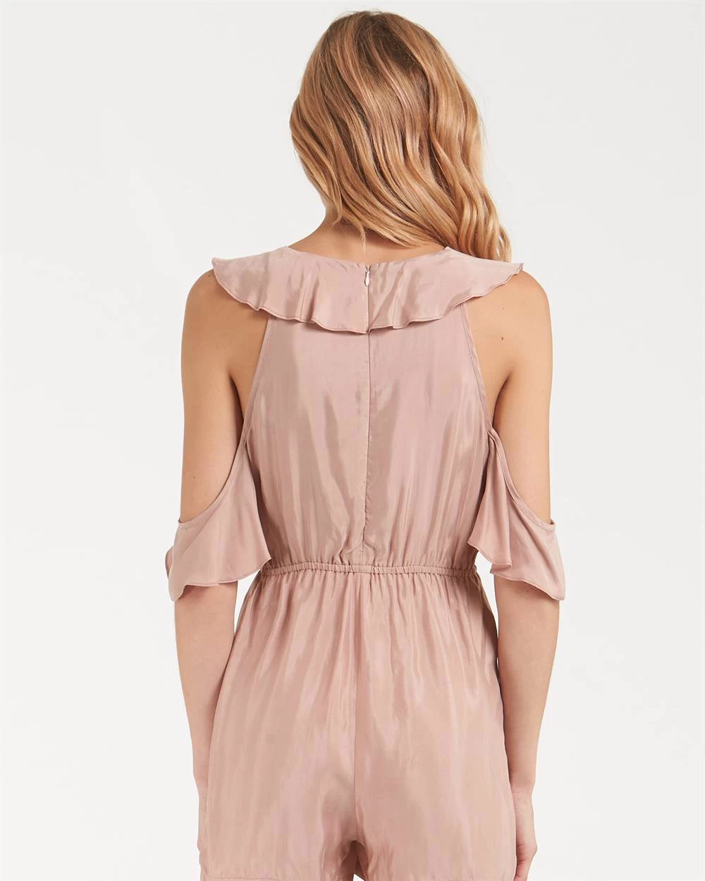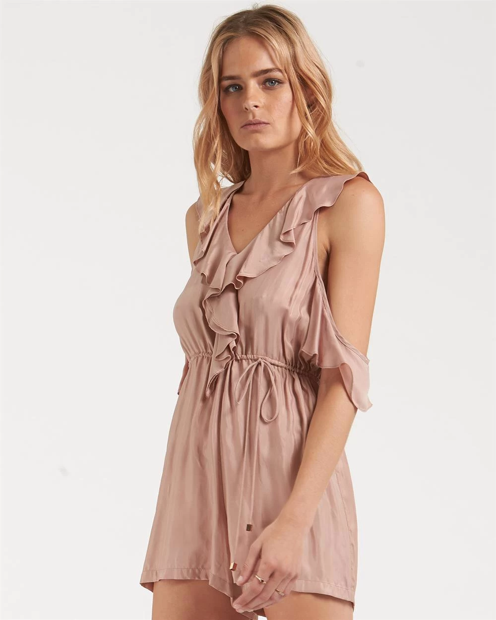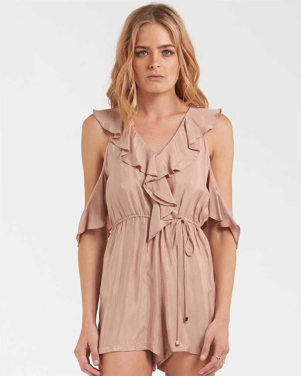 - The Allegra Playsuit by Sydney based label Amelius is the perfect piece for a feminine youthful look. The playsuit features a v neckline outlined in ruffles, off the shoulder sleeves and a drawstring waistband. The unique yet trendy colours of blush and khaki offer a piece ready for any event, and a must have in your wardrobe. Our model is wearing a size S/8. She usually takes a standard AU 8/Small, is 5’10in (178cm) tall, has a 76cm bust, 79cm hips, and a 65cm waist.
