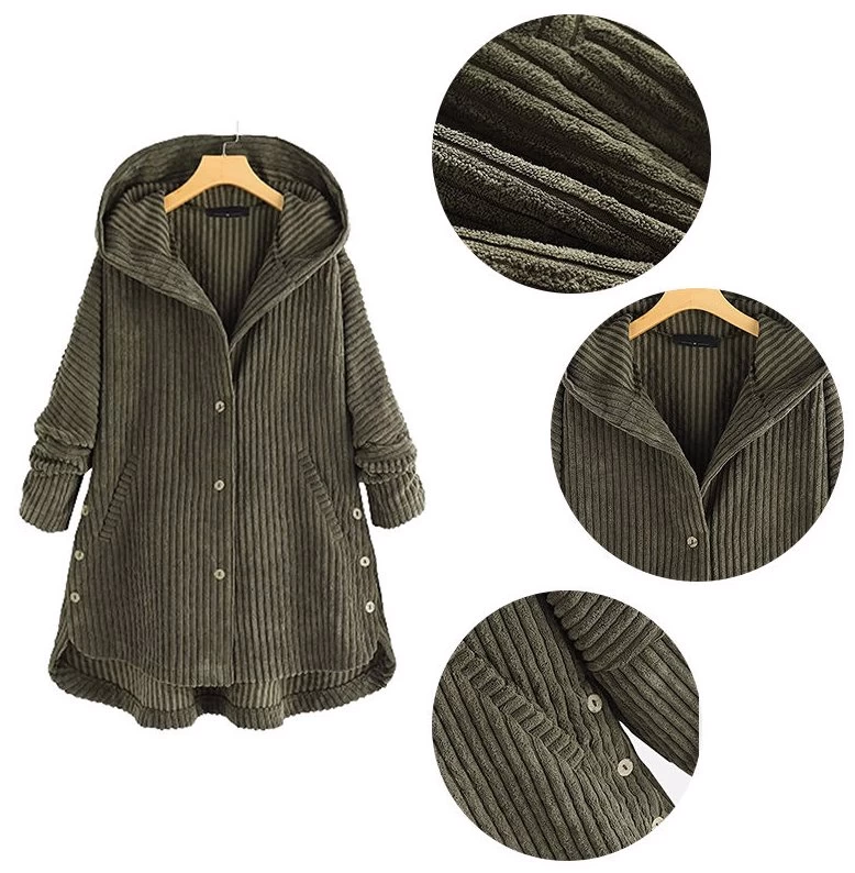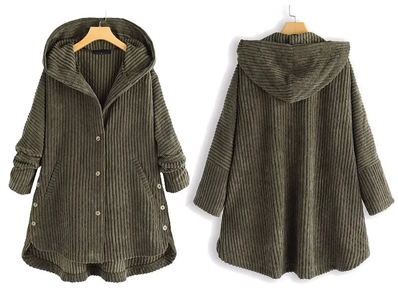 - Long sleeves, button closure, two side pockets, side slits with button closure, asymmetrical curved hem, solid color, loose fit, mid-length, loose fit hooded jacket for women. Unique in design and full of glamour, it’s a must-have in any woman’s wardrobe.