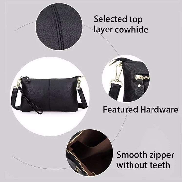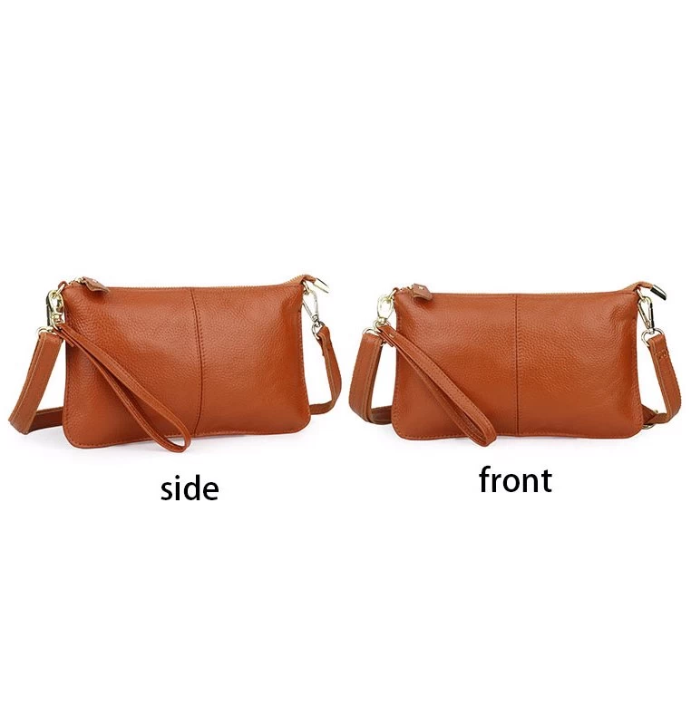 - this bag can be carried as a clutch without the need for a shoulder strap, wrist strap or cross-body, making it perfect for both dressy and casual looks. Material: cowhide, soft to the touch, silver hardware and brown fabric lining.