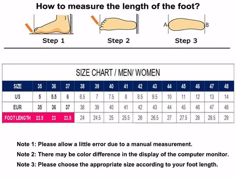 - Please refer to the shoe size chart in the picture before buying shoes to get the correct size. Since the dimensions are manually measured, there may be some errors. Please measure the length of your feet to get the best fit. Due to the different display and lighting effects of the monitor, the picture may not reflect the actual color.