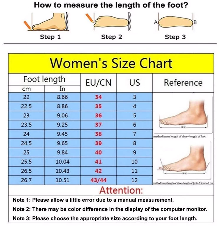 - Please refer to the shoe size chart in the picture before buying shoes to get the correct size. Since the dimensions are manually measured, there may be some errors. Please measure the length of your feet to get the best fit. Due to the different display and lighting effects of the monitor, the picture may not reflect the actual color.