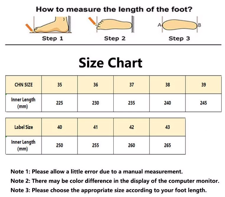 - Please refer to the shoe size chart in the picture before buying shoes to get the correct size. Since the dimensions are manually measured, there may be some errors. Please measure the length of your feet for the best fit. Due to the different display and lighting effects of the monitor, the picture may not reflect the actual color.