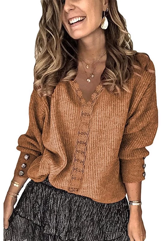 - Features: deep V neck, solid color, knitted pullover, long sleeves, loose fit, knitted pullover, long sleeves, loose fit, ribbed cuffs and hem, pullover