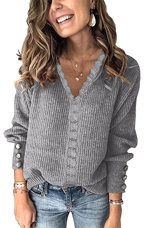 - Features: deep V neck, solid color, knitted pullover, long sleeves, loose fit, knitted pullover, long sleeves, loose fit, ribbed cuffs and hem, pullover