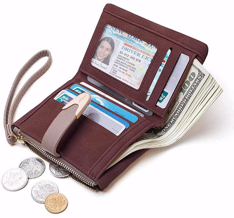 - This female wallet with 6 card slots,1 full-length compartments to put money,1 zipper coin pocket,1 wrist strap and 1 ID window, bifold and thin design,This bifold wallets for women can hold cash, credit cards,id, coins,keys,and other petty things,It stays closed and flat when stuffed.