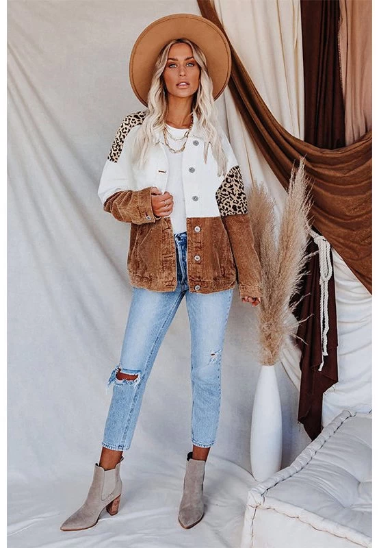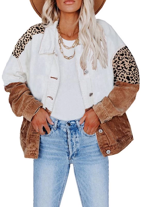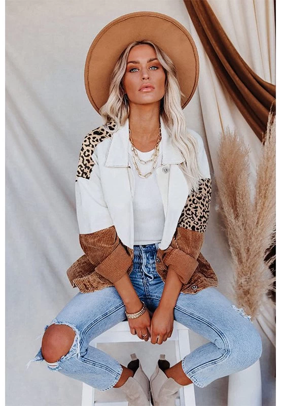 - Features: Sexy V-neck, button-down, breast pockets, leopard-print paneled denim jacket, oversized denim shirt.