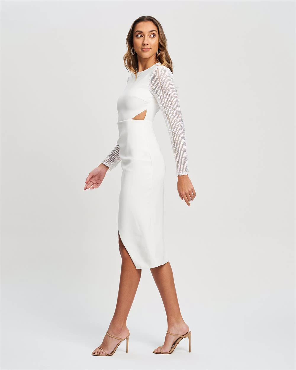 – Fitted mid-length dress with full-length sequin embellished lace sleeves