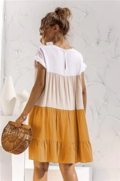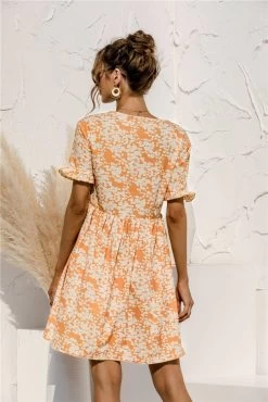 Anette Women’s Short Sleeve Polka Dot Print Breasted Pocket Dress – Orange & Beige Floral Print