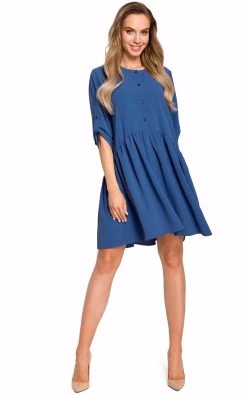 Flowing button-up front tunic-dress, featuring a wide A-line silhouette with gathering at the seam and button tab sleeves, is a perfect choice for any occasion.