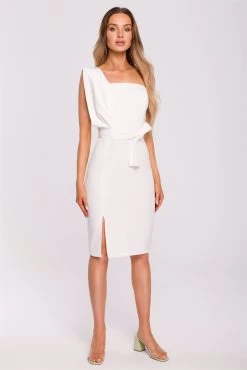 Classic pieces do not need to be boring, extravagant details only elevate elegant looks. This pencil cut dress with a draped one-shoulder detail and a tie-belt is a gorgeous proposal for brave and confident women.