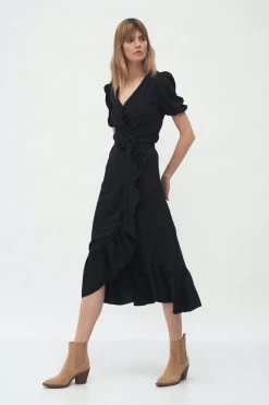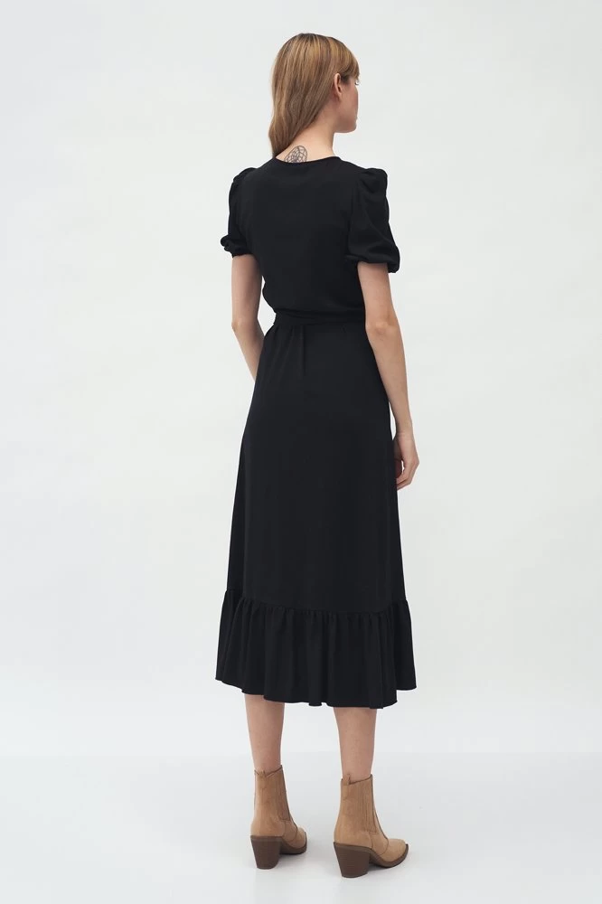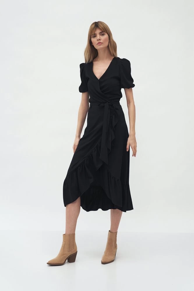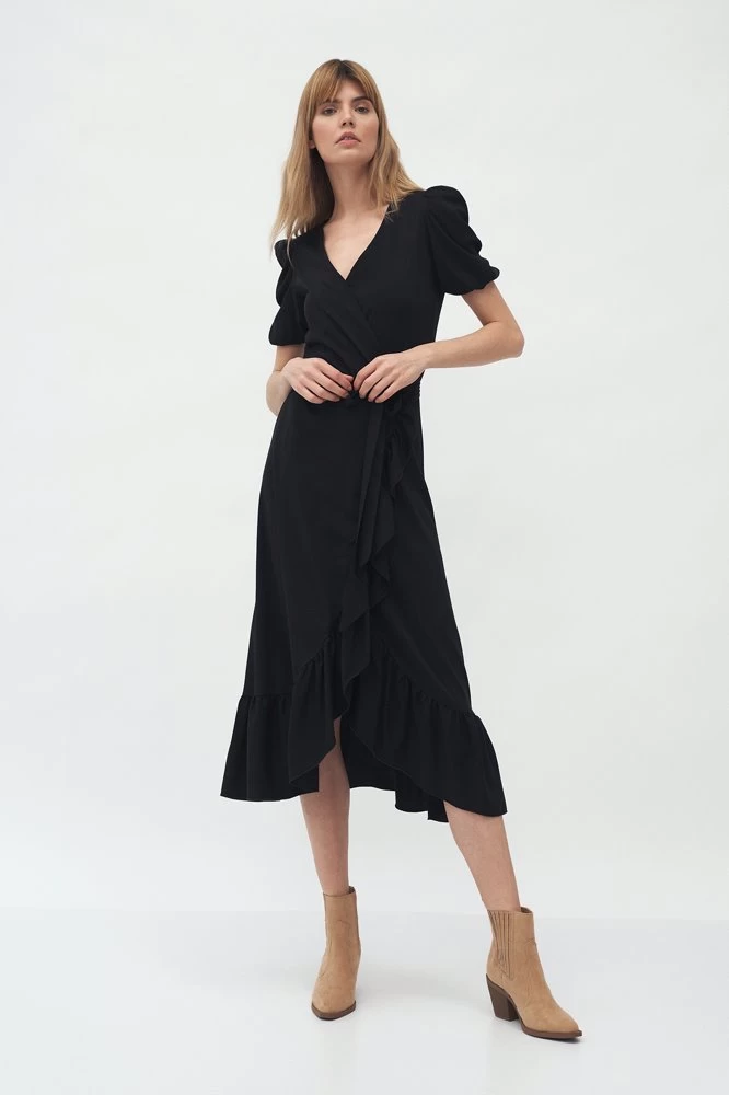 Normal fit, A midi wrapover dress tied at the waist with short puff sleeves with elastication, a v-neck and a frill going down the hem of a skirt.