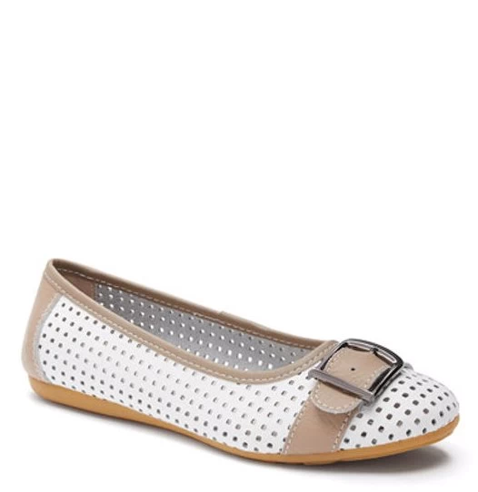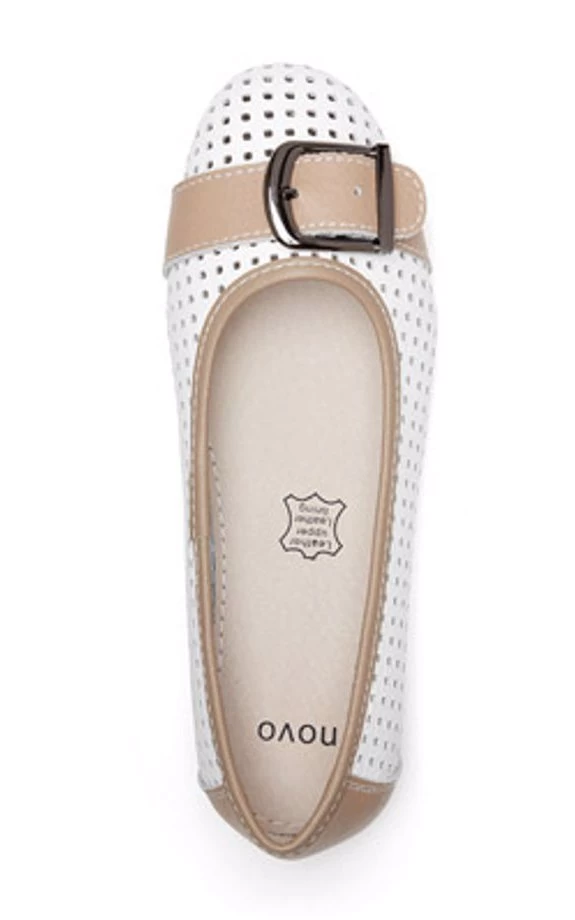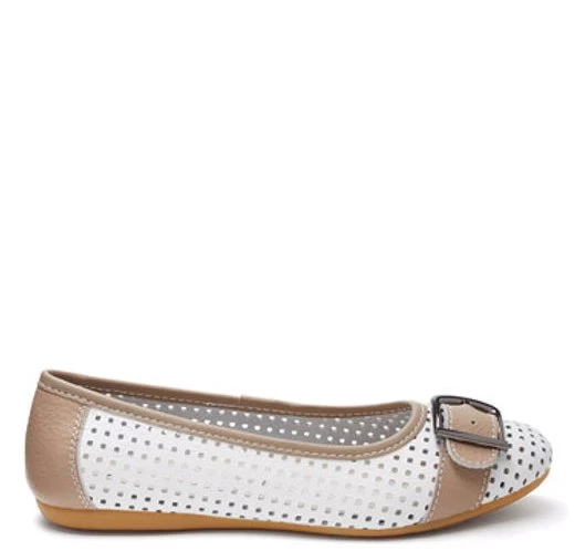 Want to add a unique ballet flat to your wardrobe? Introducing the Dolce ballet flat. This casual ballet flat is crafted with a soft leather material with pinhole detailing. The Dolce features a buckle detailing across the front of the toe. Available in black navy/tan and white/tan tones the Dolce is extremely versatile to wear with almost anything. Style the Dolce with denim jeans and a crisp white tee for a fresh look. The Dolce is constructed with leather upper and lining and synthetic outsole. Always put your best foot forward in the Dolce flat. Leather Upper Lining and Synthetic Outsole
