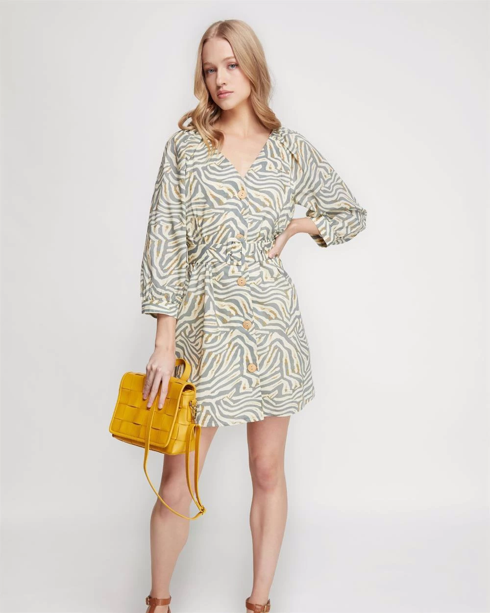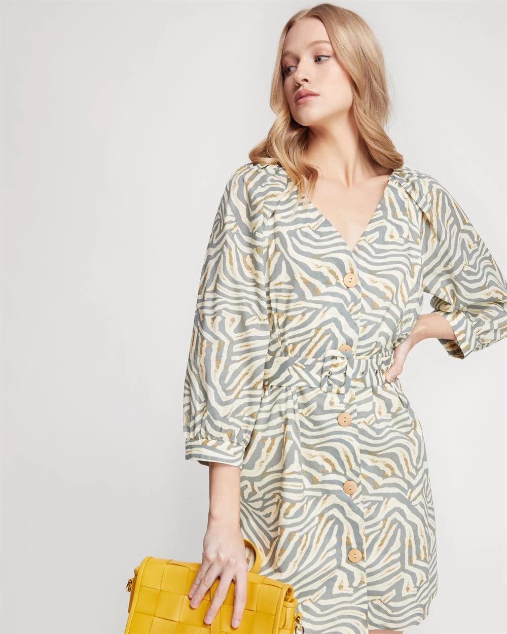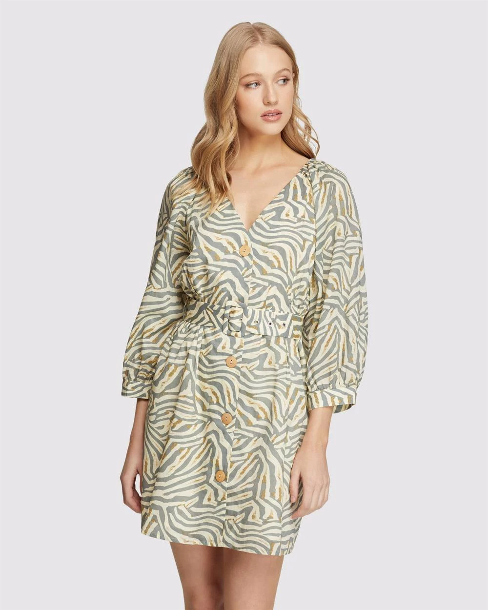 Let the season guide your style with the Peony Grey Animal Print Dress. Crafted from 100% cotton in a relaxed fit, this dress has a striking animal print and features a belted waistline, wide sleeves, and large front buttons. Just add some sandals and leather accessories for the perfect safari look. Our model is wearing a size 8 dress and usually takes a size 8. She is 178cm (5’84”) tall with an 81cm (32”) bust, a 63cm (25”) waist, and 86cm (34”) hips.