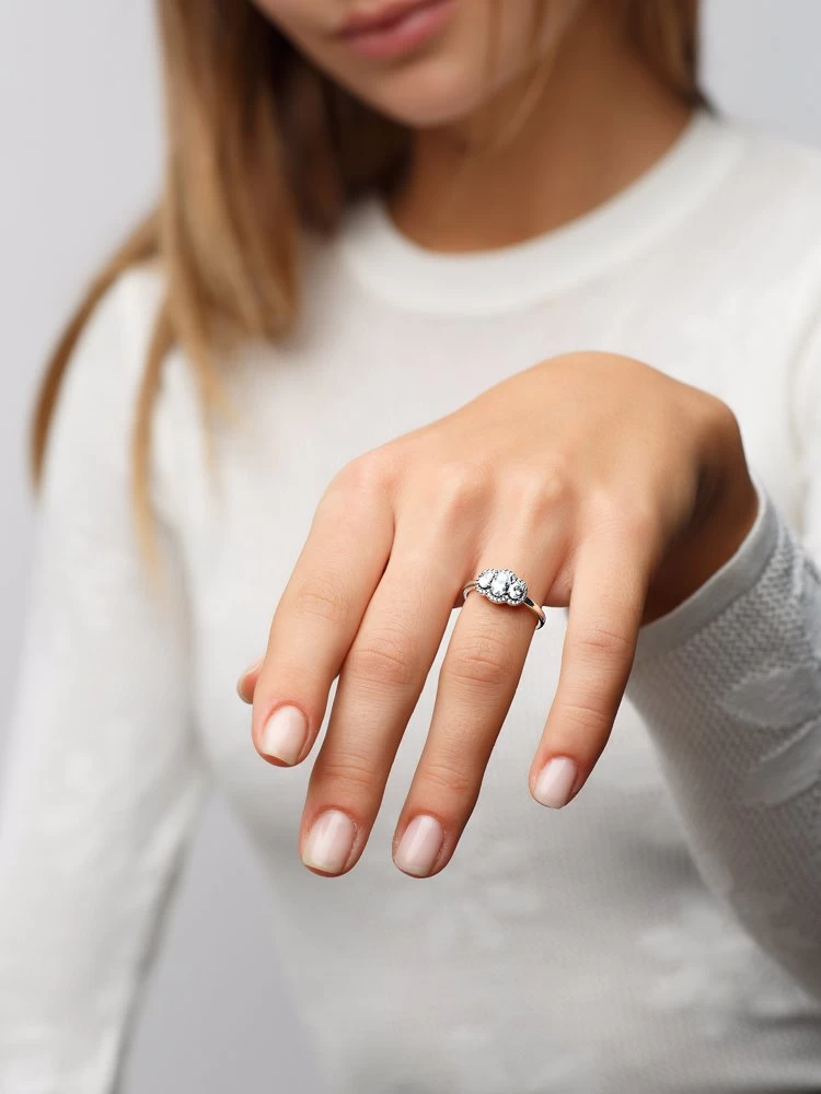 - Hand-finished in sterling silver, this ring is set with two oval cut cubic zirconia stones on either side of a large oval center stone