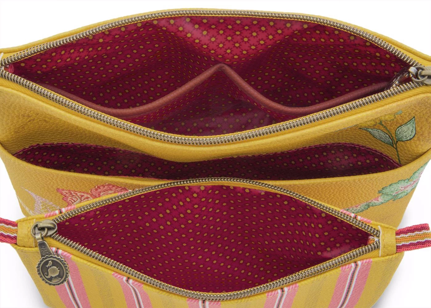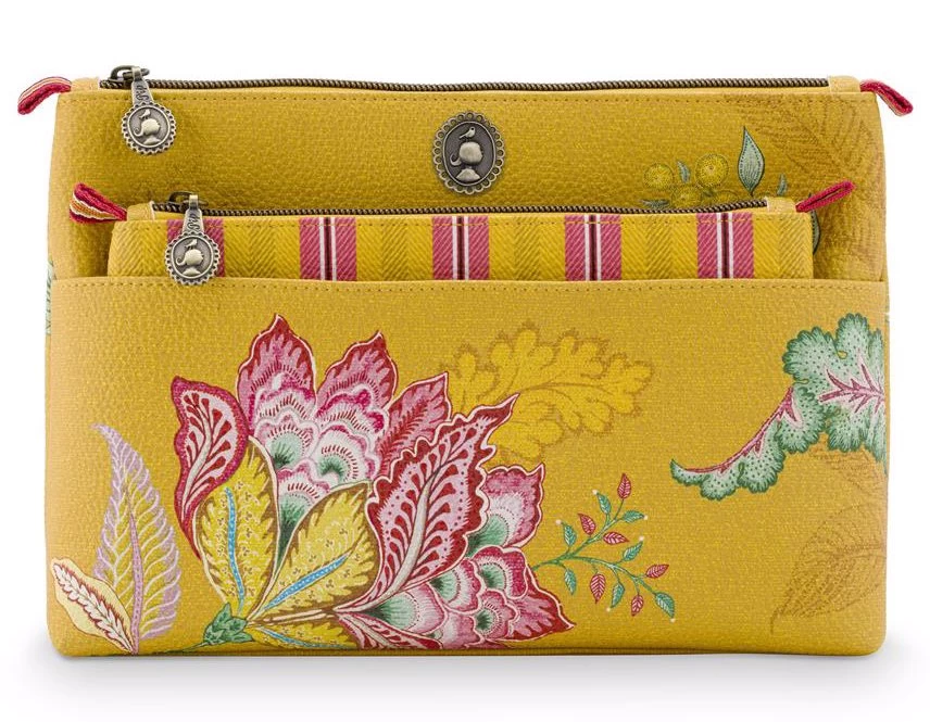 This cosmetic bag is made of 2 bags. The bags are made of water-repellent satin that is trimmed with faux leather piping. The enamel Pip logo is the finishing touch.