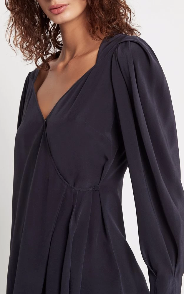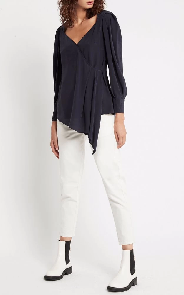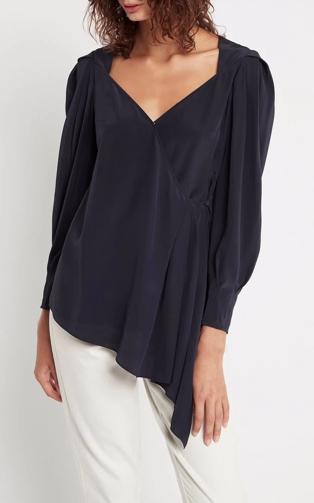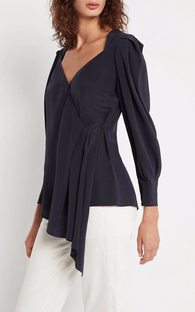 Using pleated detailing at the shoulder to create voluminous shaping through the sleeves, this slim fit top fastens at the side in a wrap style, showing off an open V-neckline and a draped asymmetric hem. Made from endlessly soft silk, the top is offered in shades of dark khaki and navy, with further detail found at the back hem split and neat button-up cuffs.