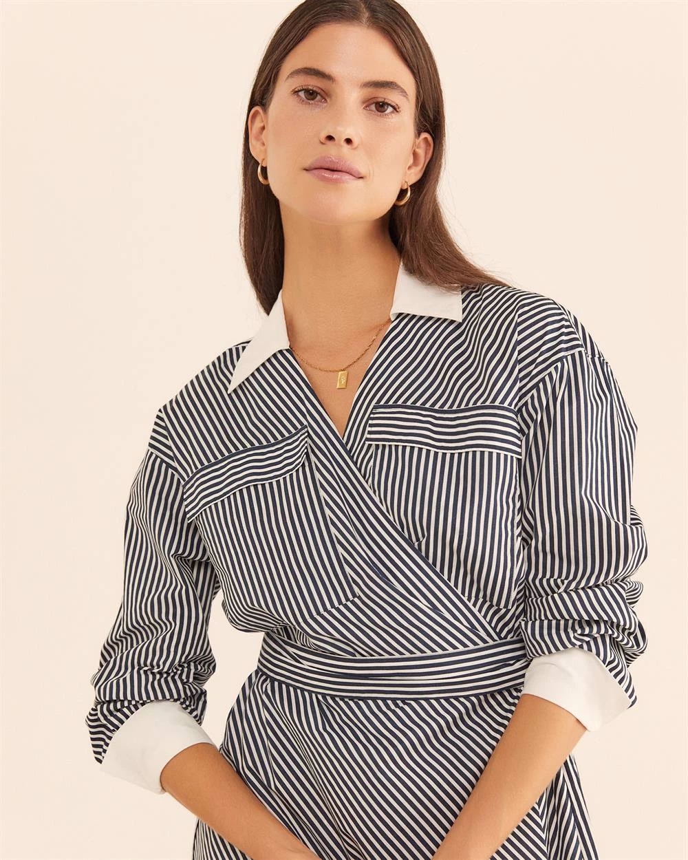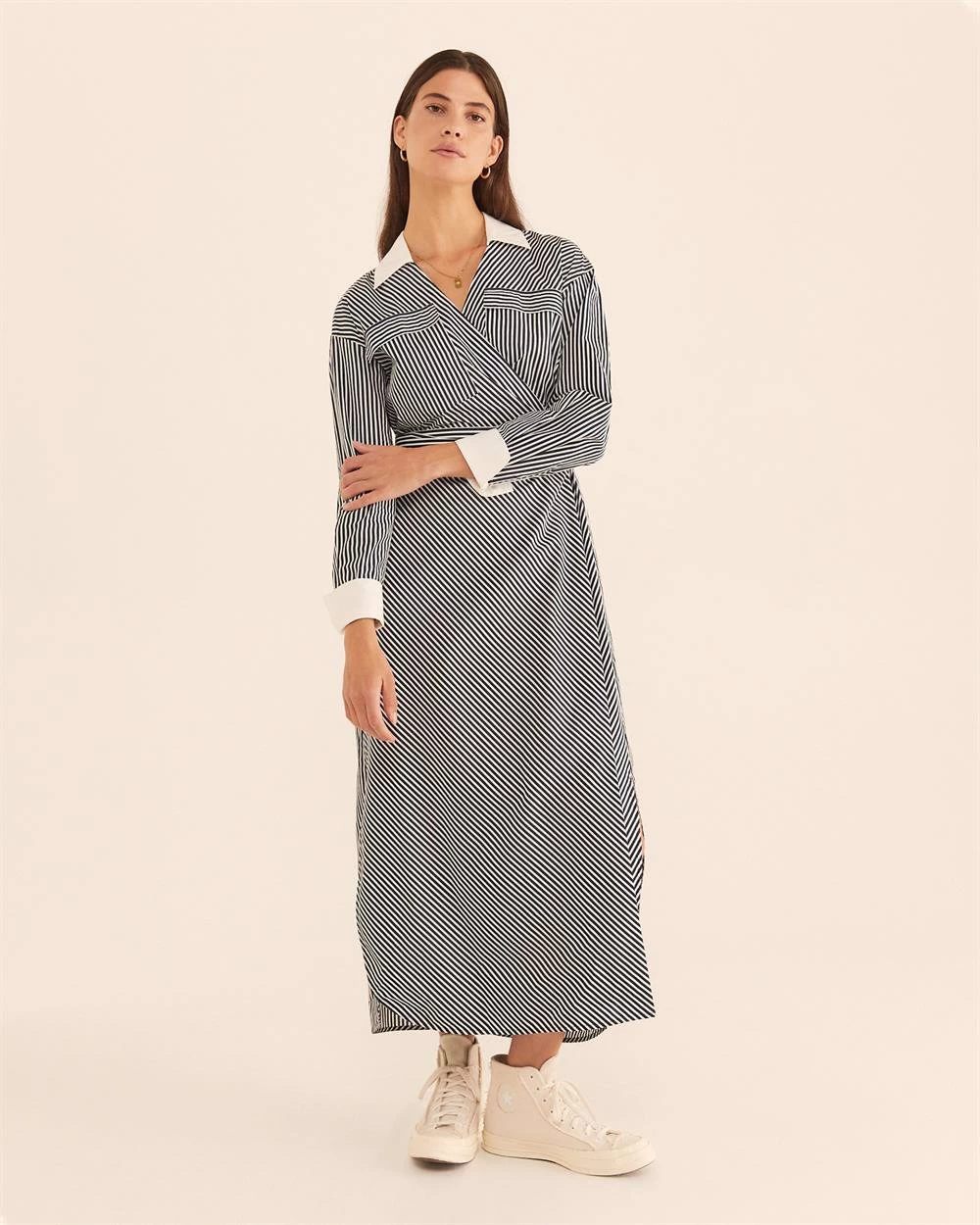 Step into style perfection with the fashion-forward Valencia Wrap Dress. Made with a stripe design, this dress includes a wrap-style silhouette, a midi-length hemline, an A-line skirt and functional patch pockets. Style with a cropped jacket and a pair of ankle boots for a truly bespoke finish.