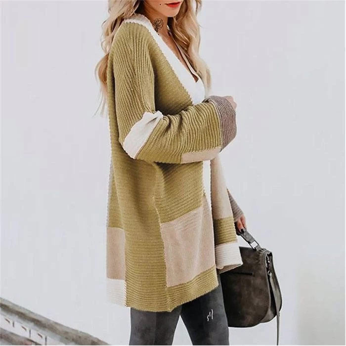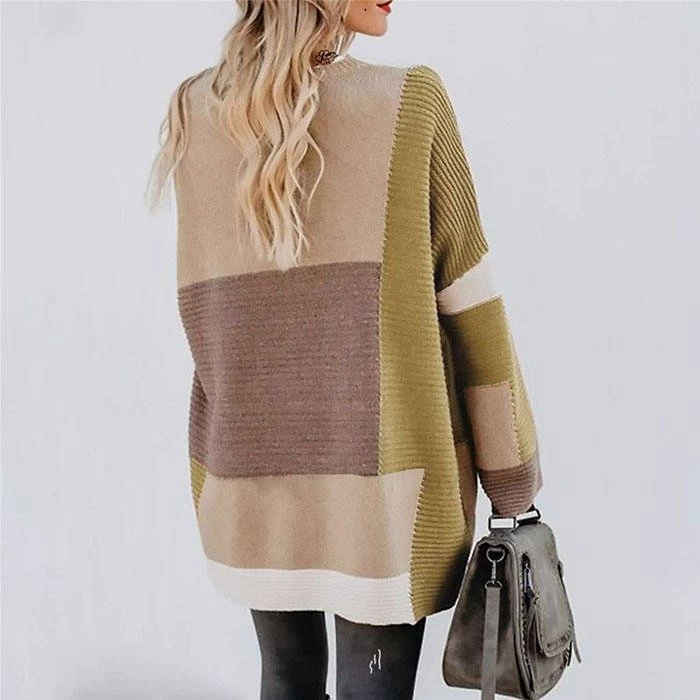 - Following long sleeves knit sweater with Mid Length. Featuring Stitching color design, comfortable and warm, a gathered detail of contrasting textured color block design, loose fit and oversized.